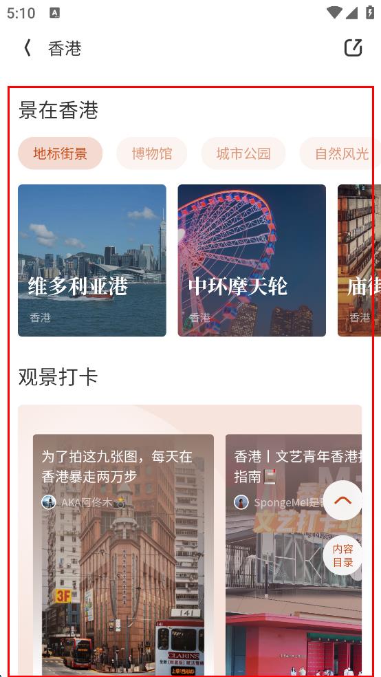 4、在香港相關(guān)頁面,即可查看“景在香港”板塊下的維多利亞港、中環(huán)摩天輪等景點(diǎn),以及“觀景打卡”板塊下的相關(guān)內(nèi)容。