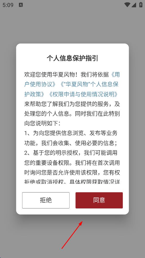 1、打開華夏風(fēng)物軟件,彈出個(gè)人信息保護(hù)指引彈窗,仔細(xì)閱讀后點(diǎn)擊“同意”按鈕,進(jìn)入軟件主界面。