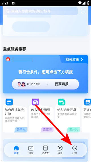 1、打開個(gè)人所得稅APP首頁,點(diǎn)擊底部導(dǎo)航欄的我的,進(jìn)入個(gè)人頁面。