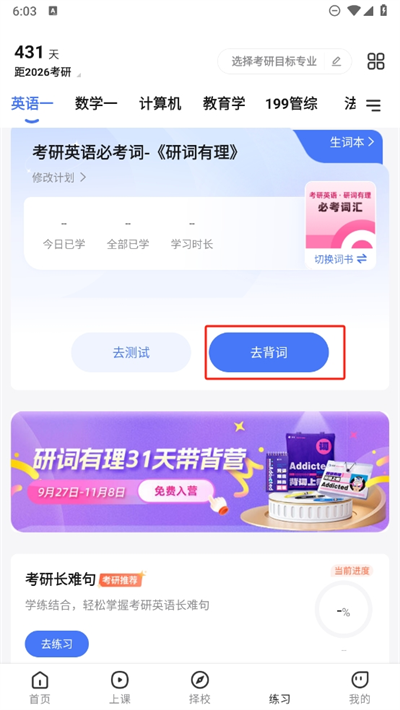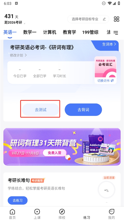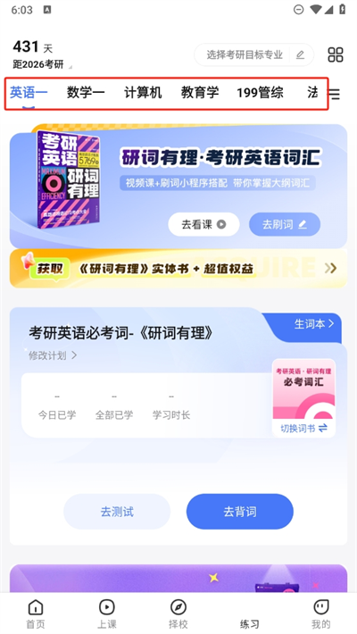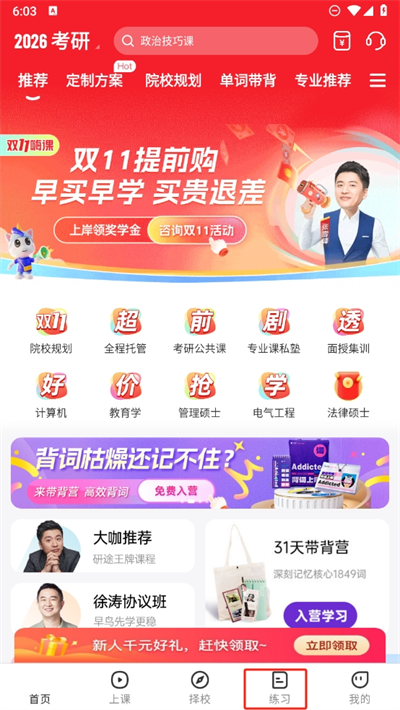 1、首頁能看到超多的教學(xué)方式,還有多種考研輔助規(guī)劃提供報(bào)考幫助,面對(duì)學(xué)習(xí)我們進(jìn)入練習(xí)欄目;
