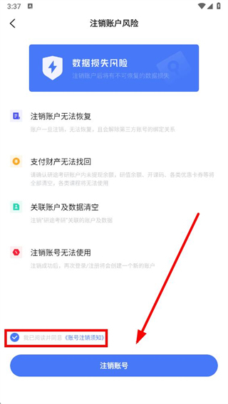 4、在注銷賬戶風(fēng)險(xiǎn)說明頁面,勾選同意賬號(hào)注銷須知,點(diǎn)擊注銷賬號(hào)即可完成研途考研賬號(hào)的注銷操作。