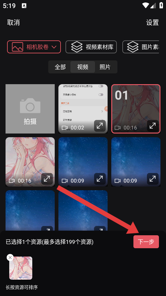 2、在視頻素材選擇界面,選取要創(chuàng)作的視頻素材,選好后點擊下一步。
