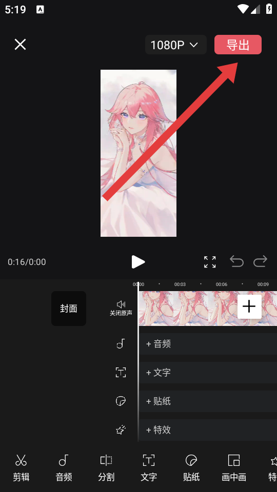3、在視頻編輯界面,可對視頻進行剪輯等操作,完成編輯后點擊右上角導(dǎo)出。