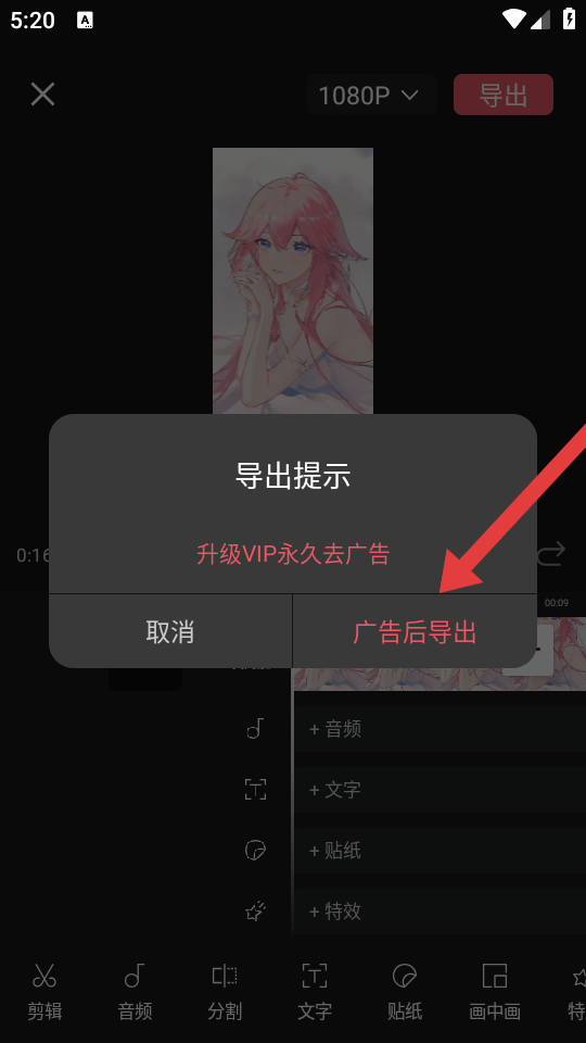 4、在彈出的導(dǎo)出提示框中,點擊廣告后導(dǎo)出,即可完成視頻創(chuàng)作與導(dǎo)出。