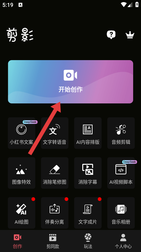 1、打開剪影APP創(chuàng)作頁面,點擊開始創(chuàng)作,進入視頻素材選擇界面。