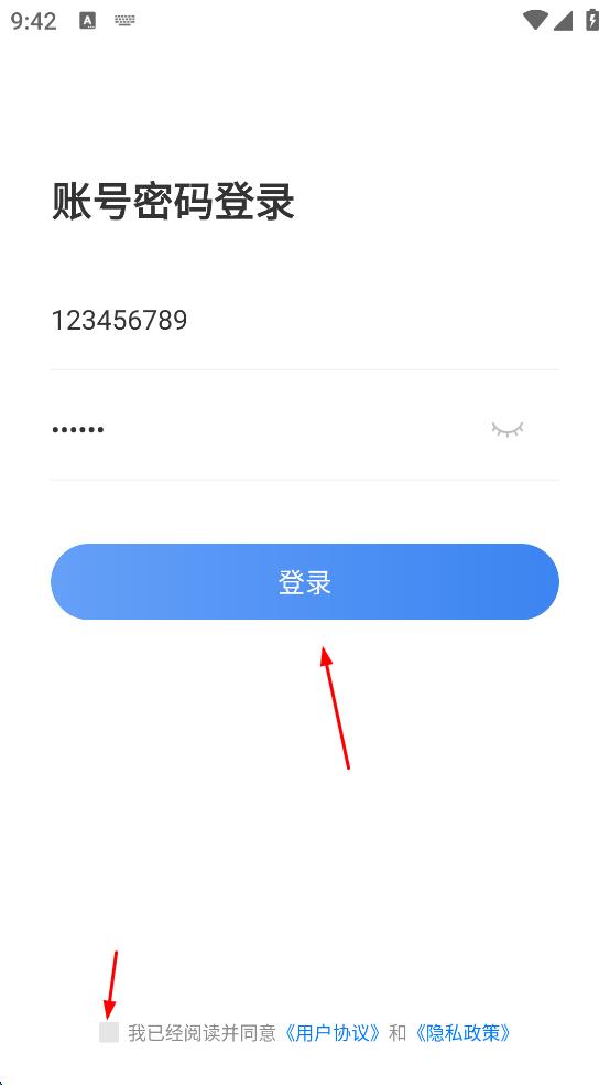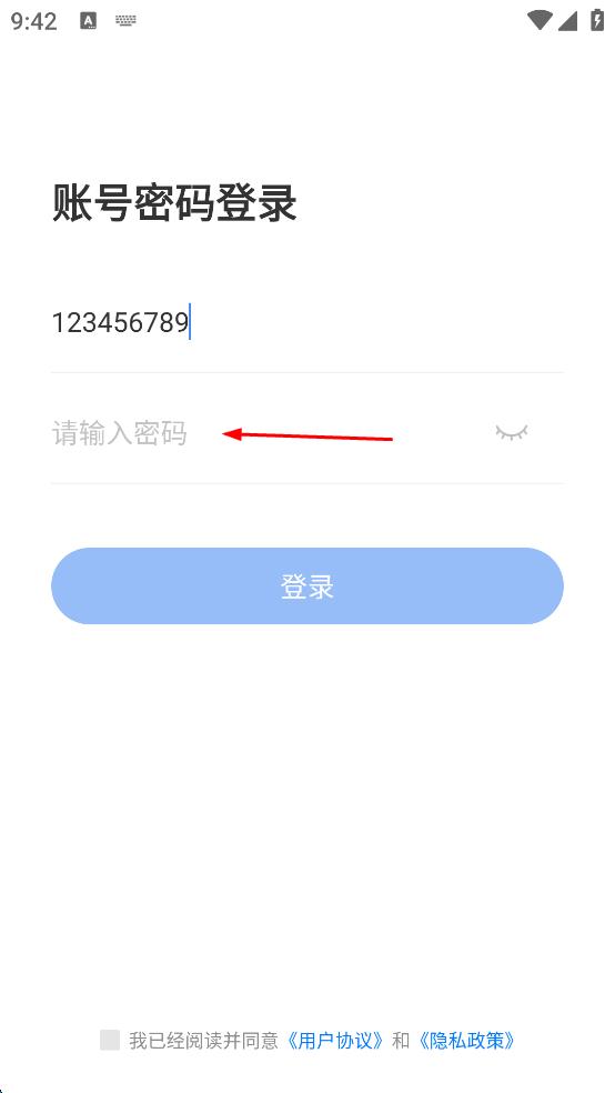 3、接著在密碼輸入框中輸入密碼,勾選我已經(jīng)閱讀并同意用戶協(xié)議和隱私政策。