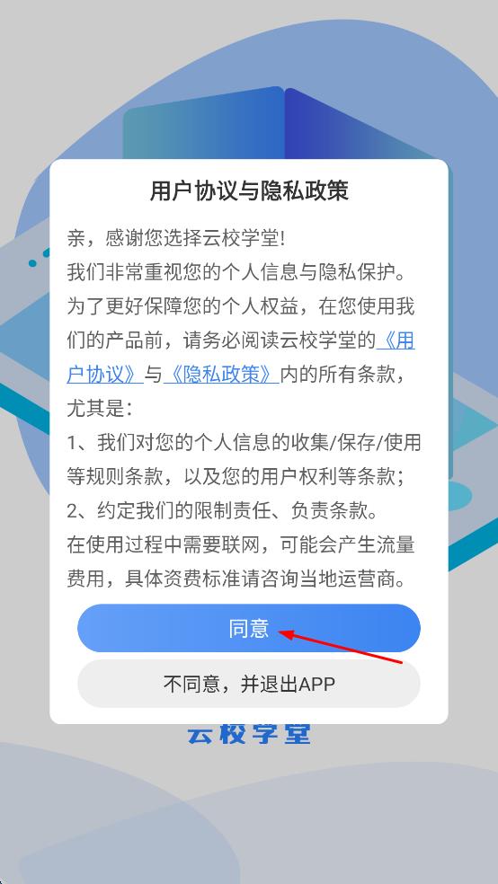 1、打開云校學(xué)堂,進(jìn)入后看到用戶協(xié)議與隱私政策提示,點(diǎn)擊同意按鈕。