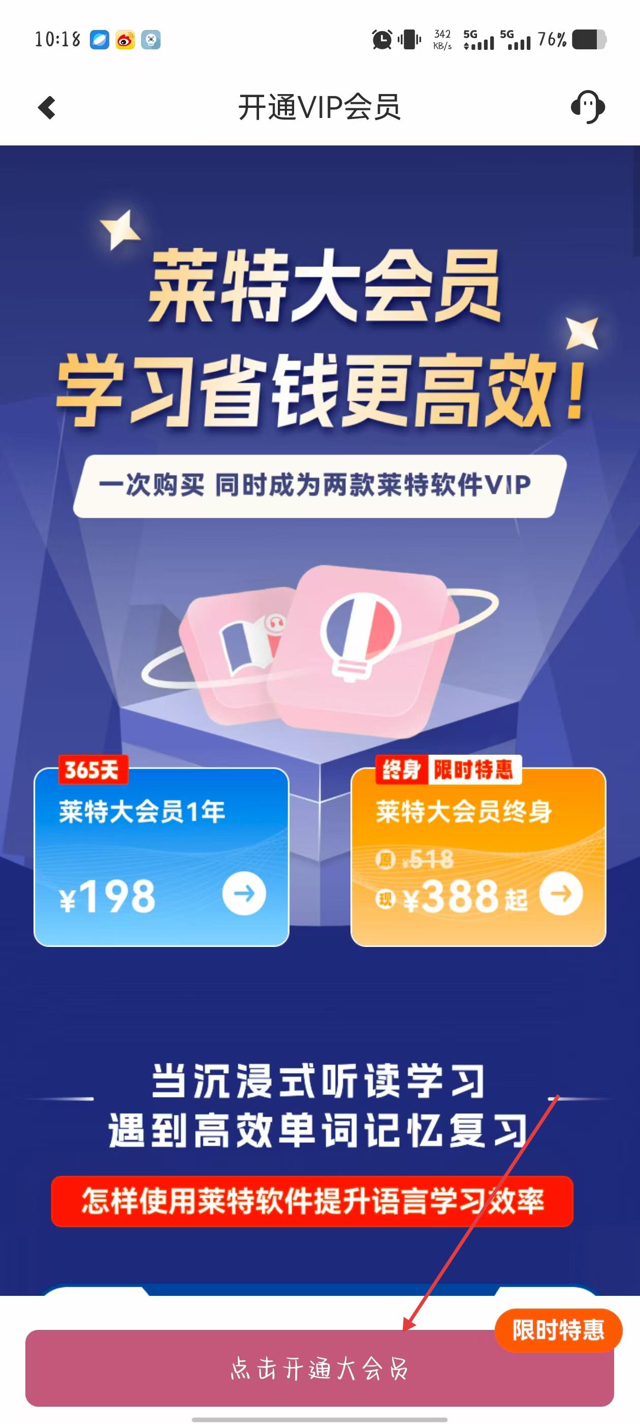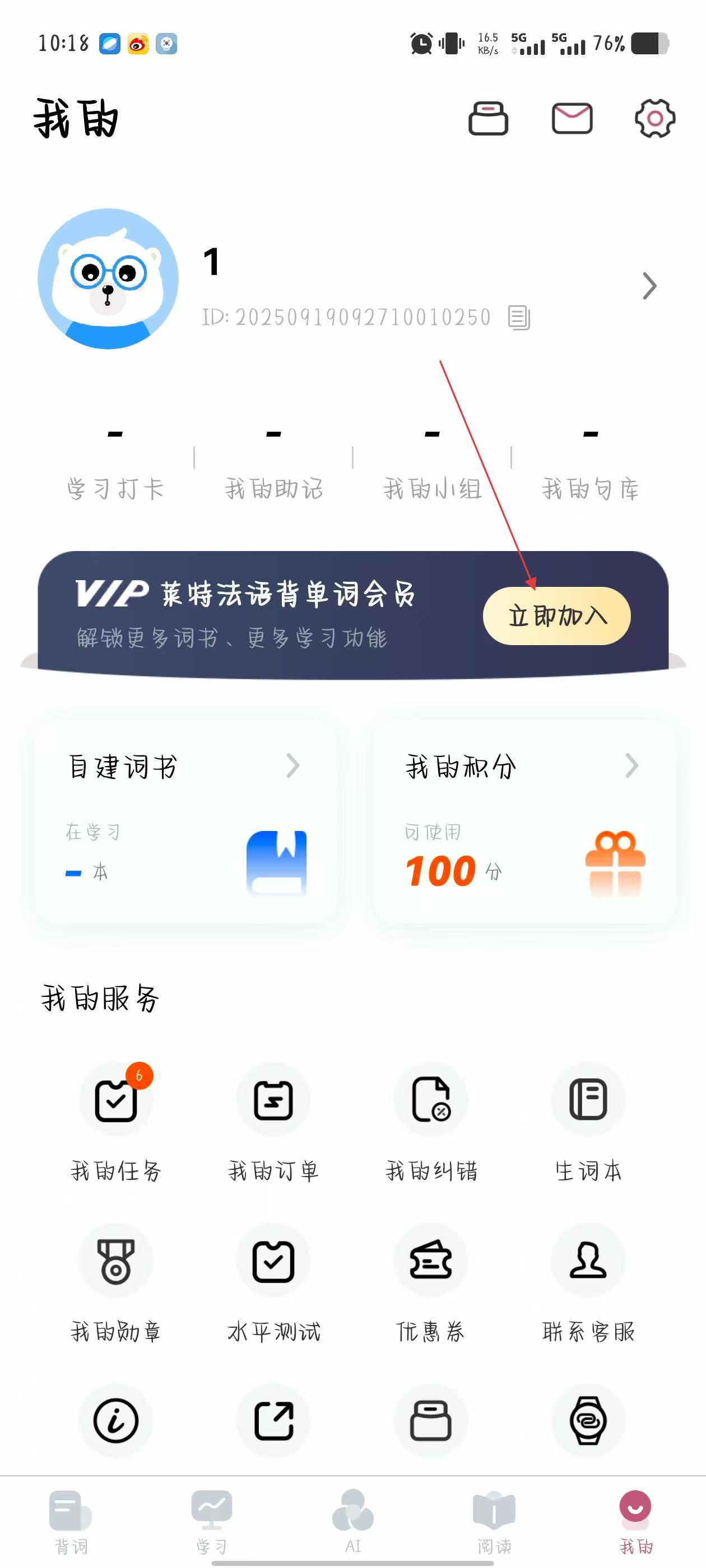 1、打開(kāi)萊特法語(yǔ)背單詞APP,進(jìn)入個(gè)人頁(yè)面,在頁(yè)面中找到萊特法語(yǔ)背單詞會(huì)員區(qū)域,點(diǎn)擊立即加入按鈕。
