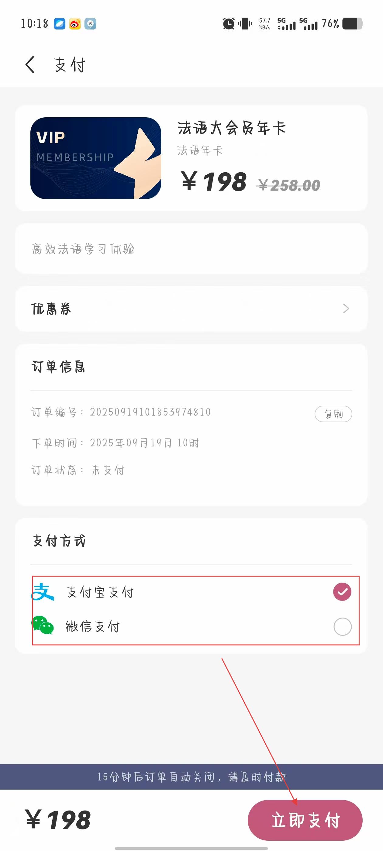 4、進(jìn)入支付頁(yè)面后,選擇支付方式,確認(rèn)訂單信息無(wú)誤后,點(diǎn)擊立即支付按鈕即可開(kāi)通會(huì)員。