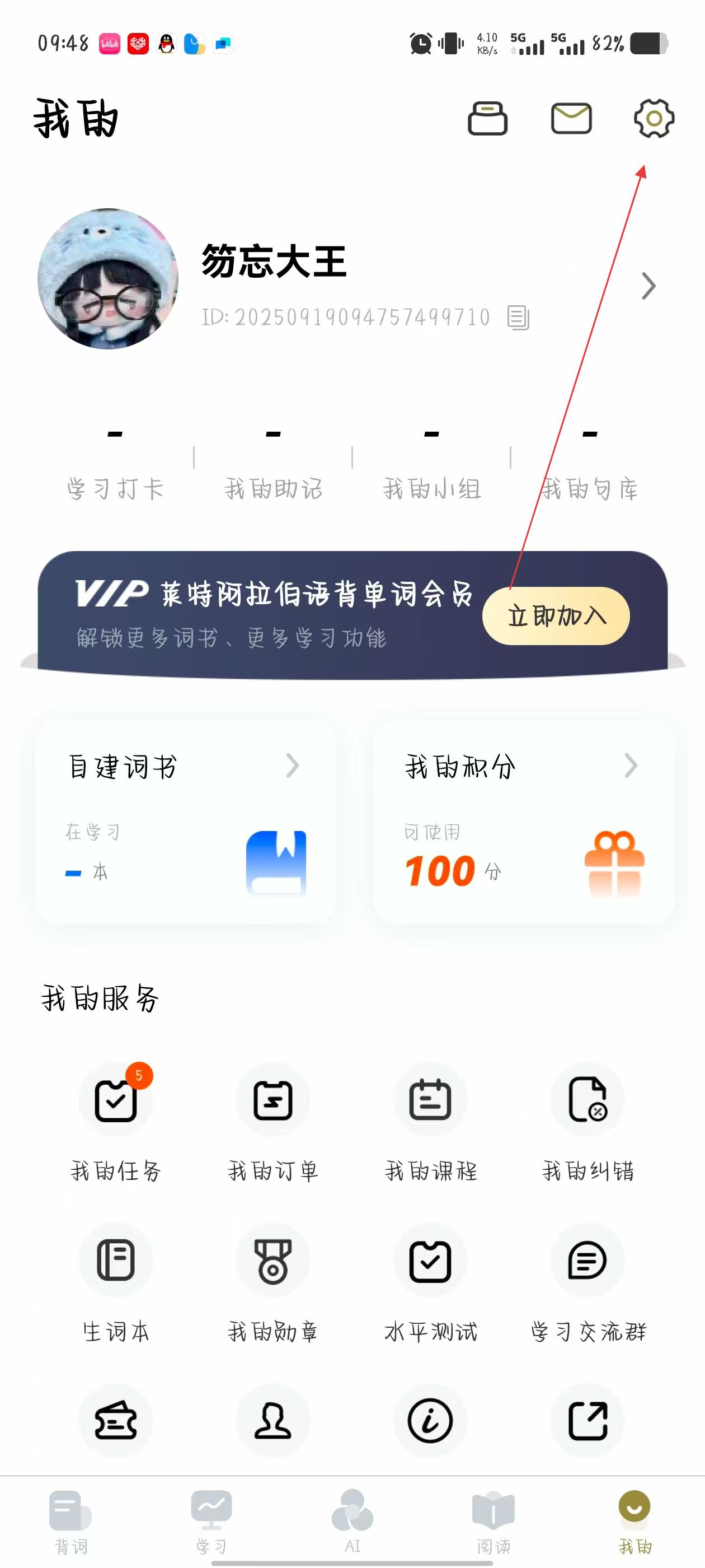 1、打開萊特阿拉伯語學(xué)習(xí)背單詞APP,進入個人頁面,隨后點擊頁面右上角的設(shè)置圖標。