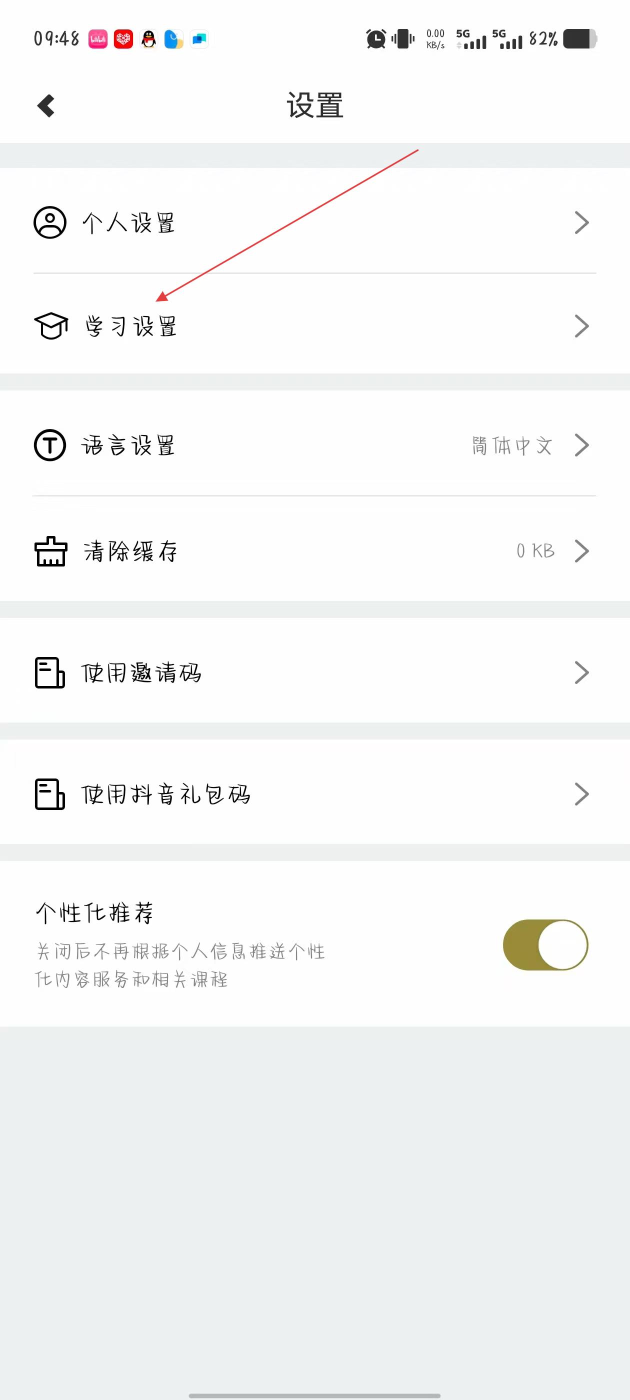2、在設(shè)置界面里,找到學(xué)習(xí)設(shè)置選項并點擊,進入學(xué)習(xí)設(shè)置頁面。