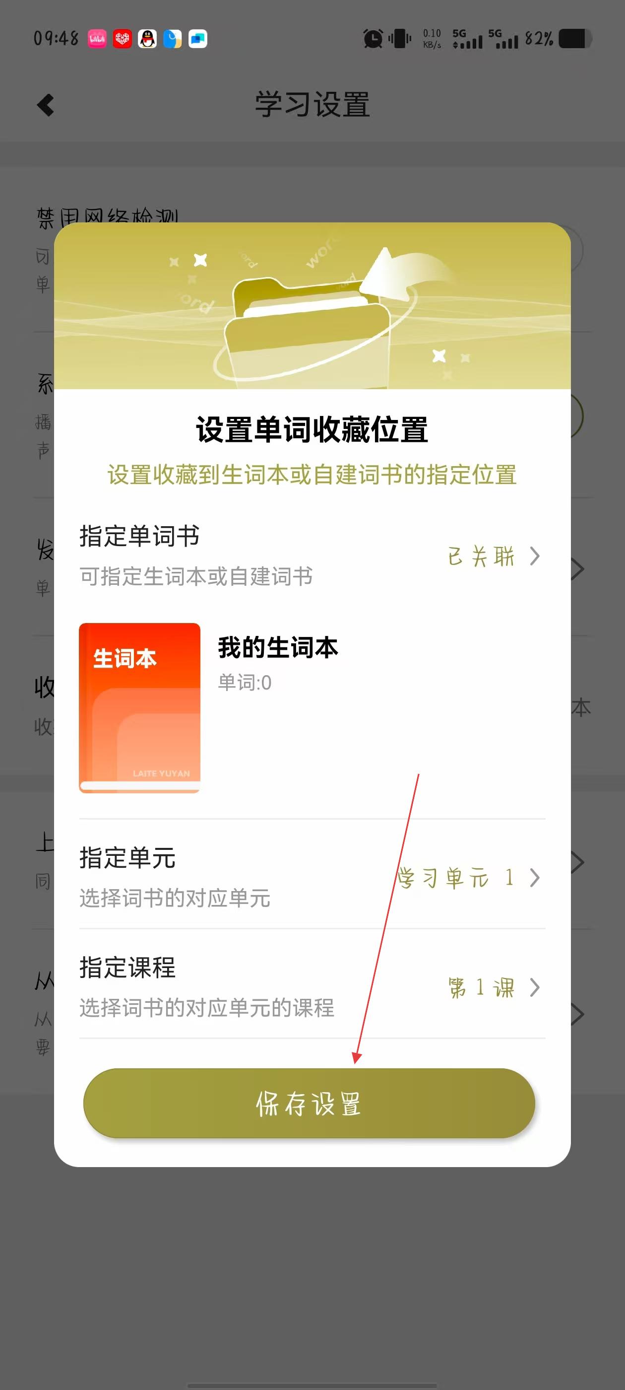 4、在窗口內(nèi)可指定收藏單詞到生詞本或者自建詞書等位置,然后點擊窗口底部的保存設(shè)置即可。