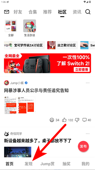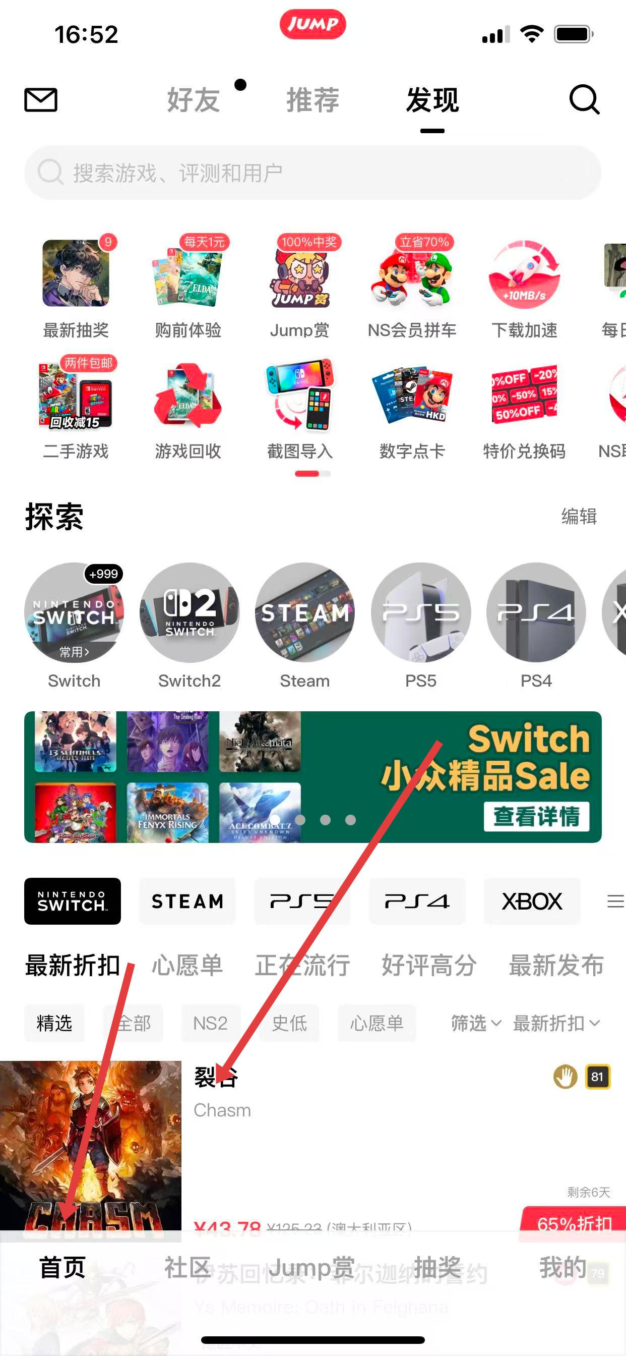 1、打開Jump軟件,點擊底部發(fā)現(xiàn),可瀏覽游戲折扣、熱門游戲等推薦內(nèi)容。