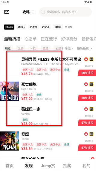 對比Switch&Steam全球價格,商店打折一目了然?!罢劭厶嵝选弊屇悴辉馘e過骨折和史低,半價玩到3A大作不是夢。