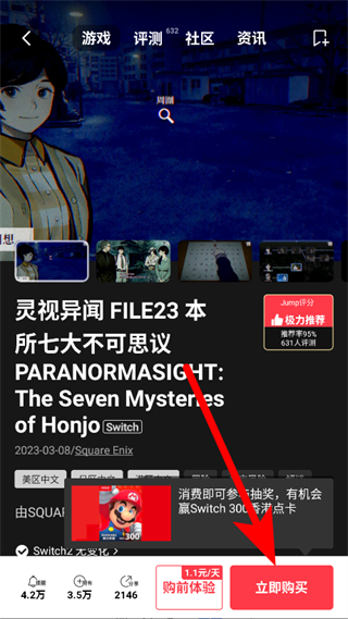 3、在游戲詳情頁可查看游戲評分、介紹等信息,若需購買,點擊立即購買。