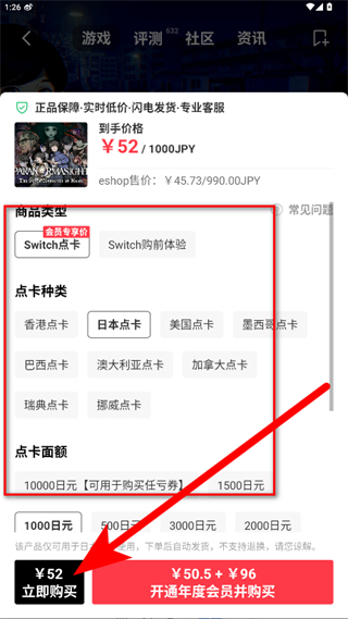 4、進入購買頁面后,選擇商品類型如Switch點卡、點卡種類如日本點卡、點卡面額,再點擊立即購買完成交易。