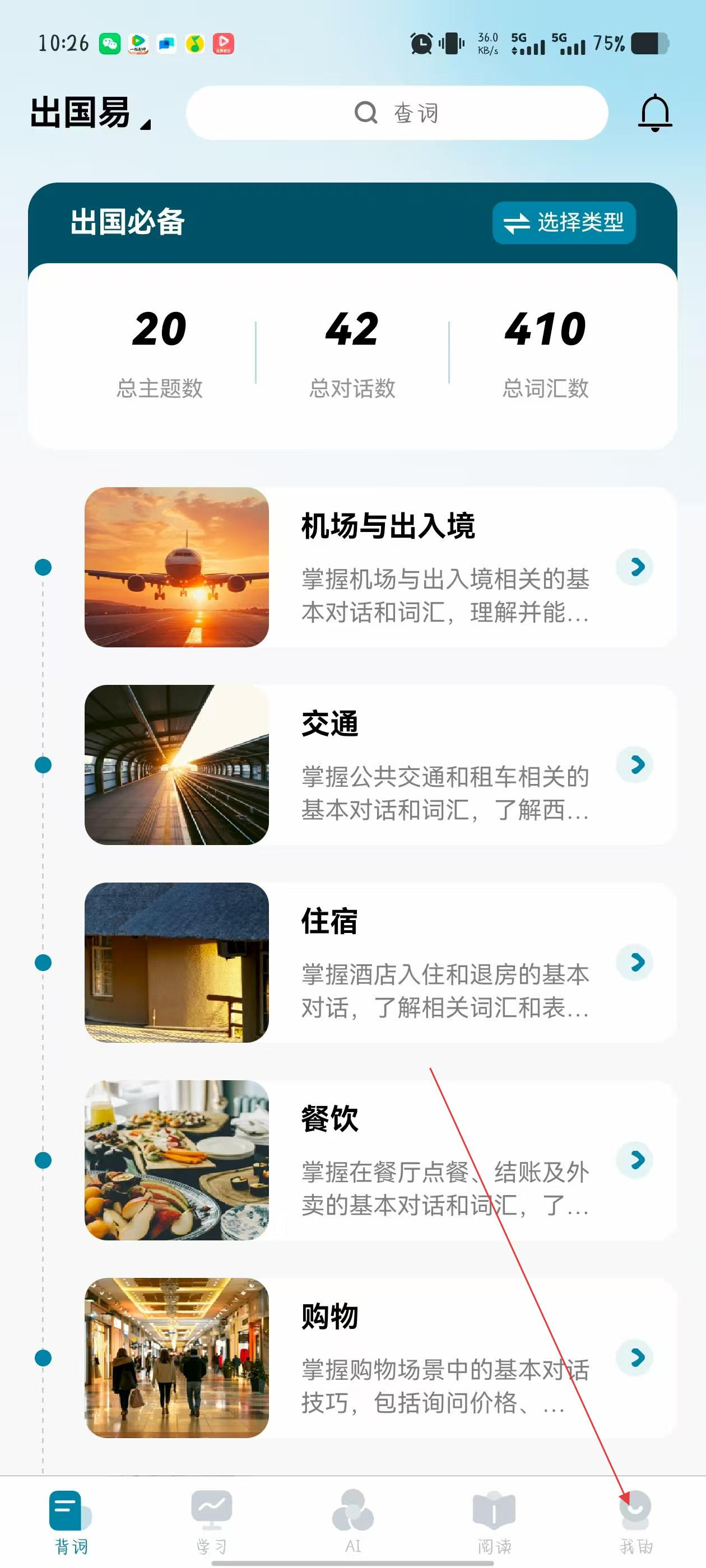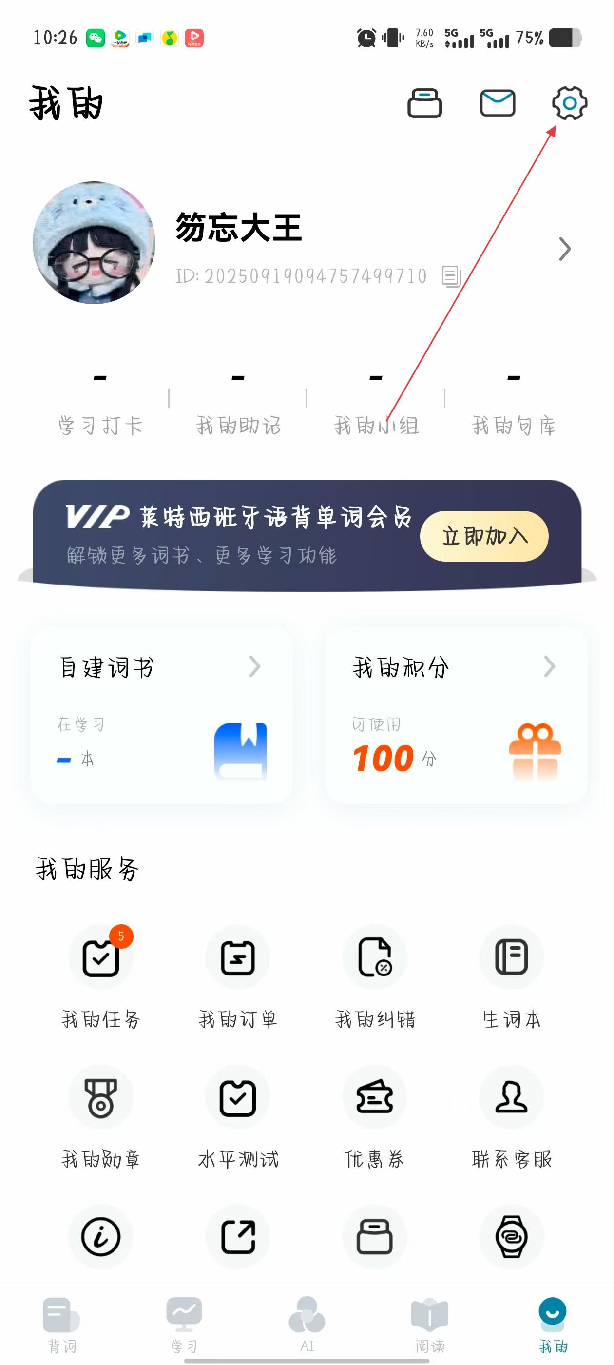 1、打開(kāi)萊特西班牙語(yǔ)背單詞APP,點(diǎn)擊底部導(dǎo)航欄最右側(cè)的我的,進(jìn)入個(gè)人頁(yè)面。