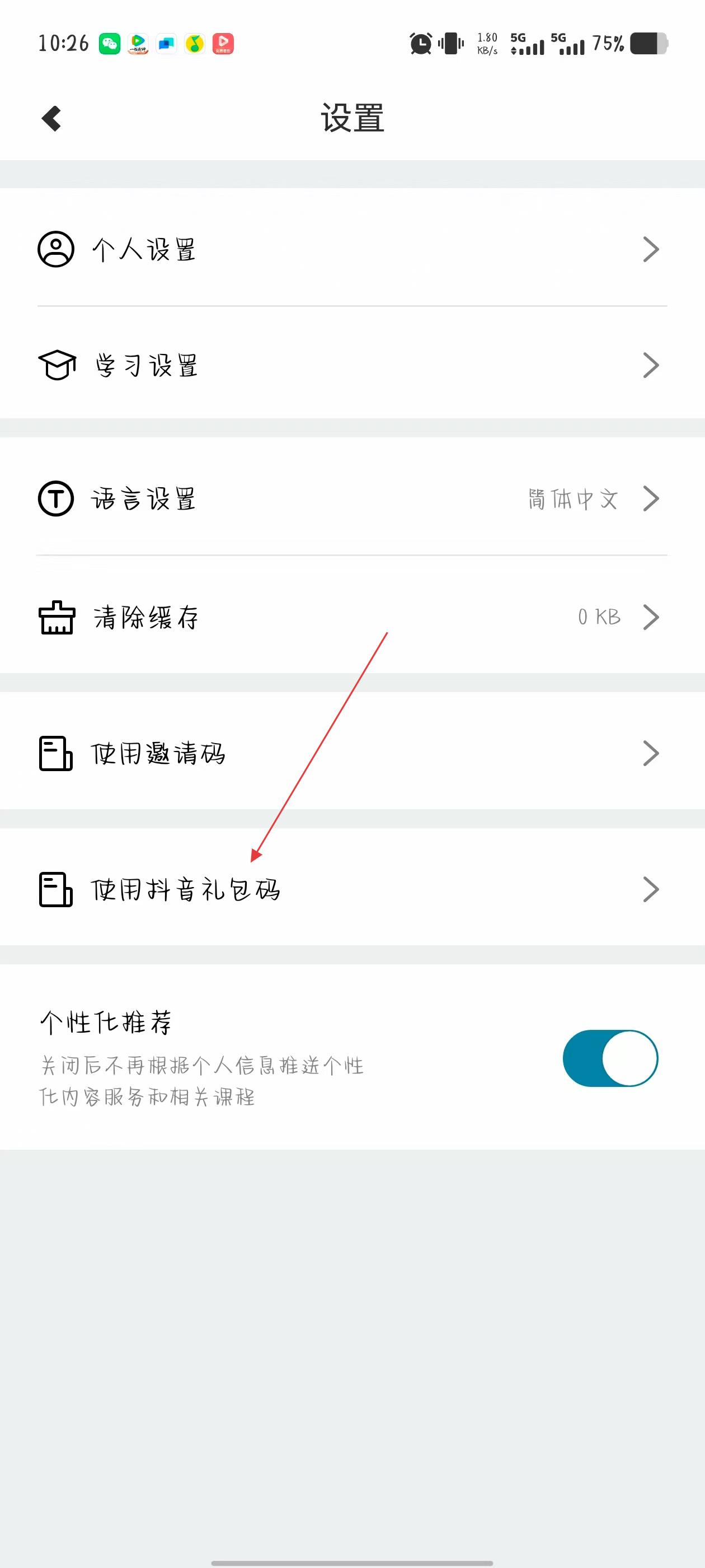 3、在設(shè)置界面里,找到使用抖音禮包碼選項(xiàng)并點(diǎn)擊,進(jìn)入抖音禮包碼輸入頁(yè)面。