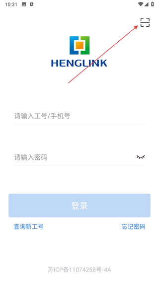1、打開HENGLINK APP,點(diǎn)擊右上角掃碼圖標(biāo)。