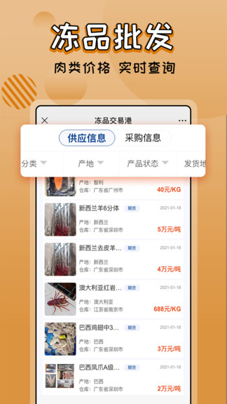 凍品交易港是一款在手機(jī)上交易各種凍品批發(fā)的軟件,軟件有成熟的交易系統(tǒng),在上面可以放心交易,不用擔(dān)心交易安全與否。app上商品多種多樣,主要分為肉類,牛、羊、豬,和水產(chǎn)類,魚、蟹、蝦。都有可靠的貨物來源,還能在平臺(tái)上找到海外好貨品進(jìn)行購買,或著通過軟件找海外代理購買。