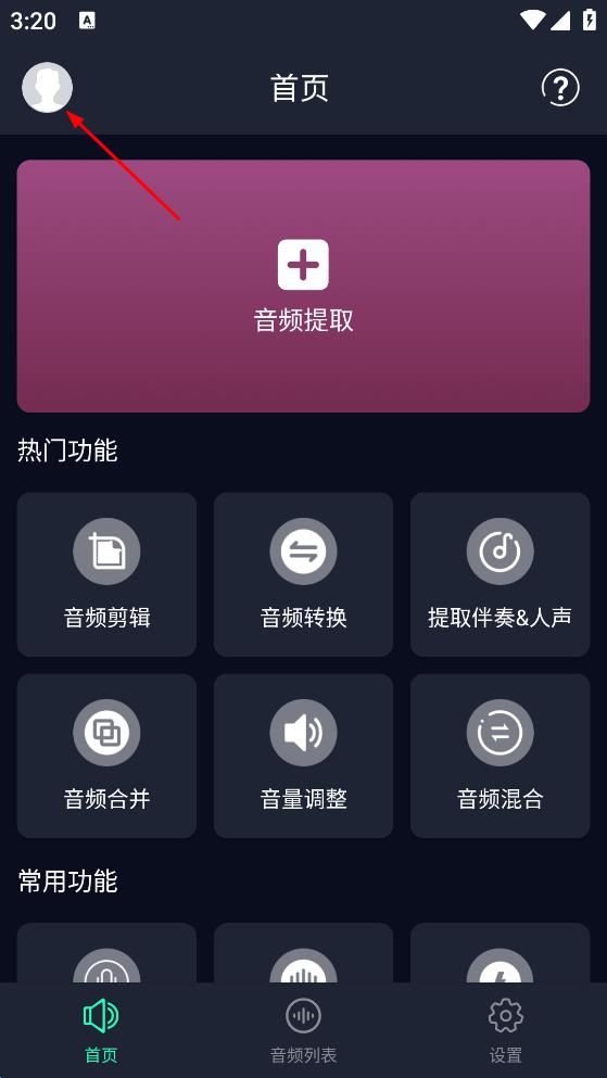 1、打開音頻處理軟件,點(diǎn)擊頁(yè)面左上角頭像圖標(biāo)。