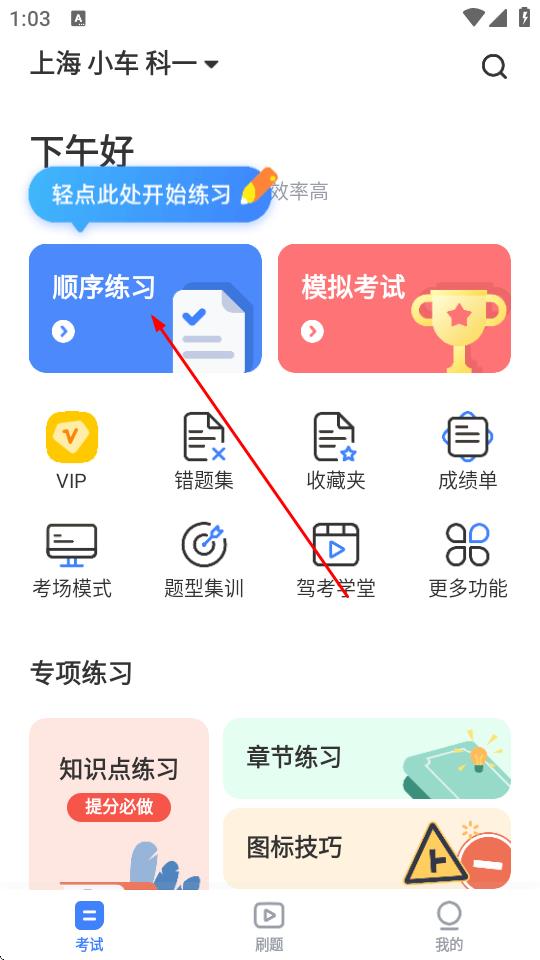 1、打開駕考刷題APP,進(jìn)入首頁,確認(rèn)考試類型,點擊順序練習(xí)模塊。
