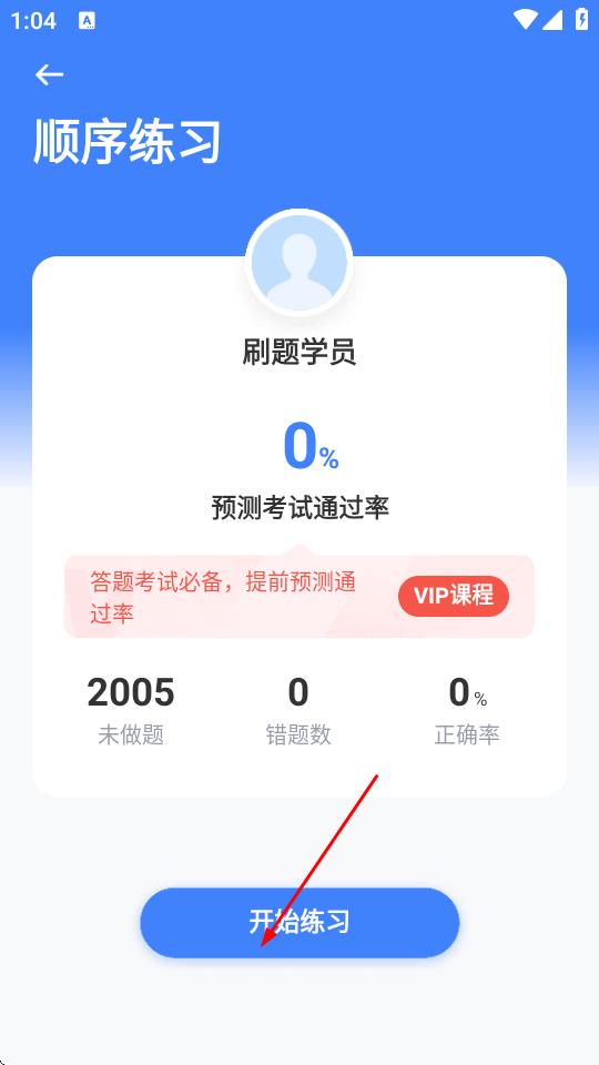 2、進(jìn)入順序練習(xí)頁面,查看個人的刷題數(shù)據(jù)統(tǒng)計,包括未做題數(shù)量、錯題數(shù)和正確率等,點擊開始練習(xí)按鈕。