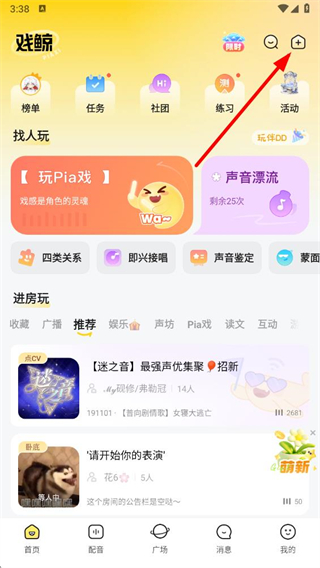 1、打開戲鯨app,在首頁(yè)點(diǎn)擊右上角的加號(hào)圖標(biāo),創(chuàng)建或加入一個(gè)房間。