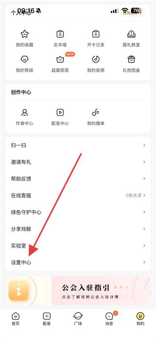 2、在個(gè)人頁(yè)面中找到設(shè)置中心選項(xiàng)并點(diǎn)擊,進(jìn)入設(shè)置功能列表頁(yè)面。