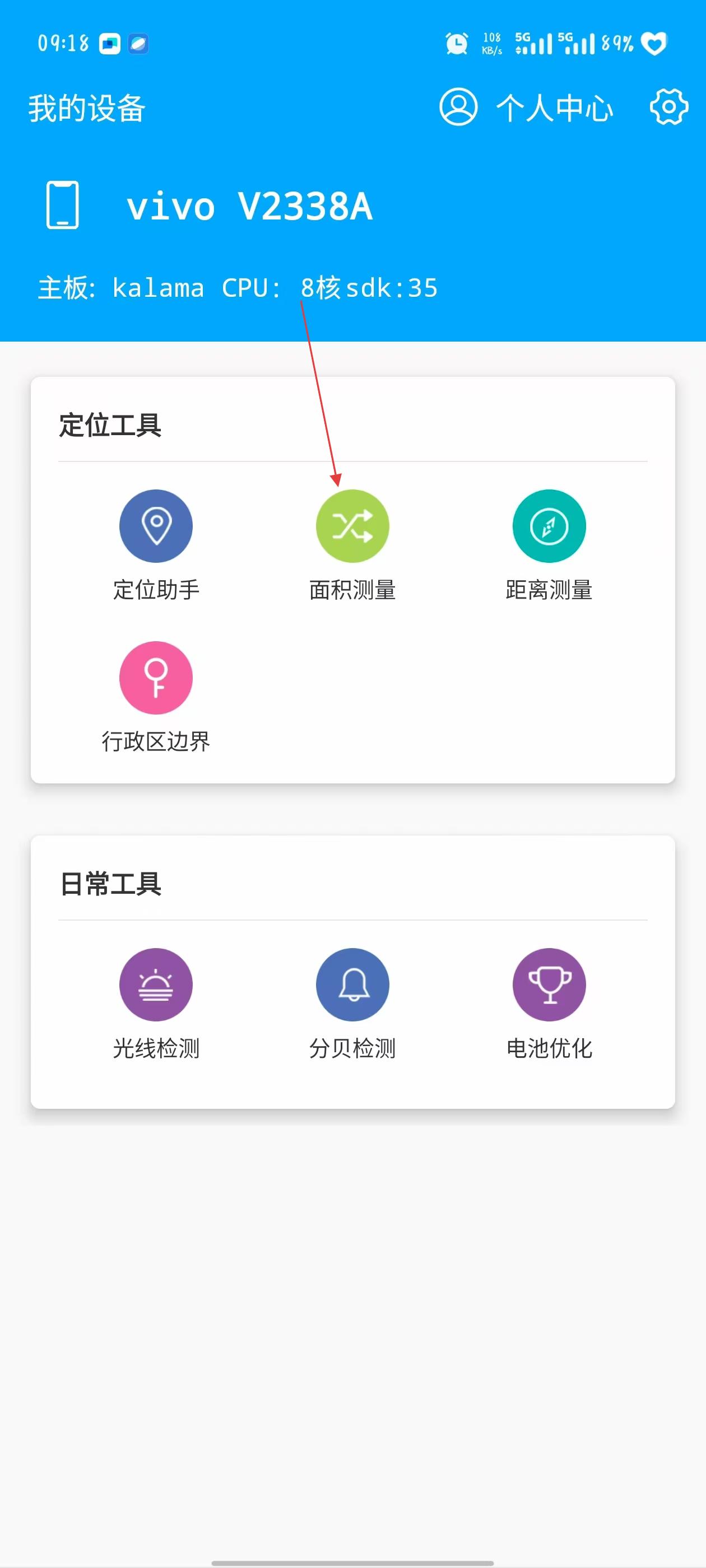 1、打開小鵬定位助手APP,在軟件界面中找到面積測(cè)量功能選項(xiàng)并點(diǎn)擊。