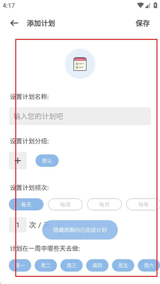可設(shè)置每天/每周/自定義/無(wú)限周期內(nèi)目標(biāo)次數(shù),以及指定一周內(nèi)哪些天去做。