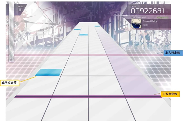 1、注意短音符是最基礎的音符,但是有立體和扁體兩種形狀,扁平在下方判定線點擊;