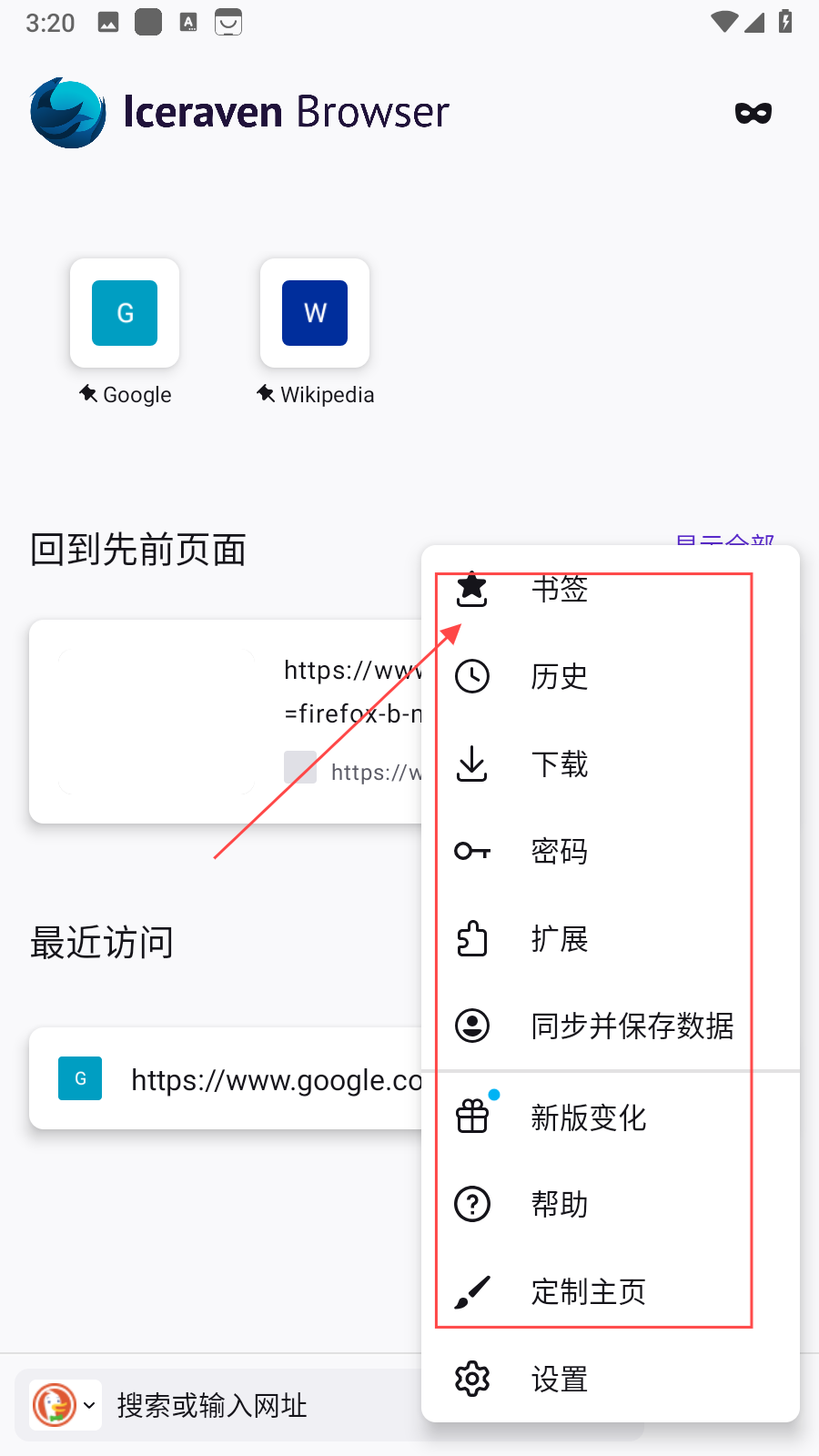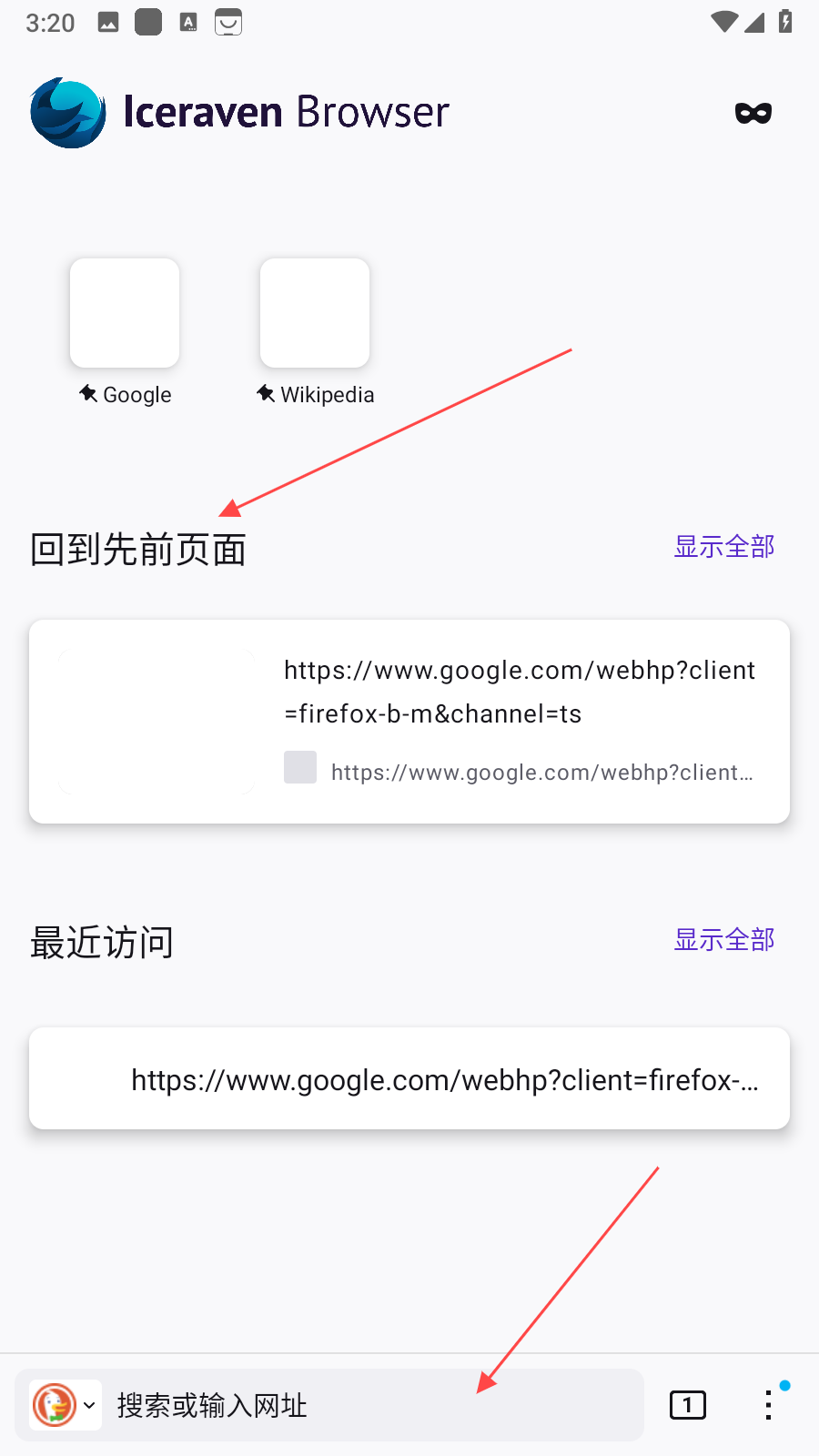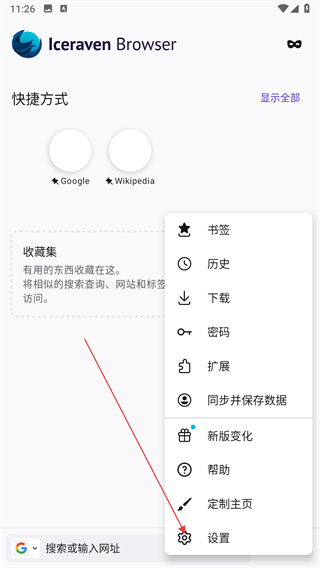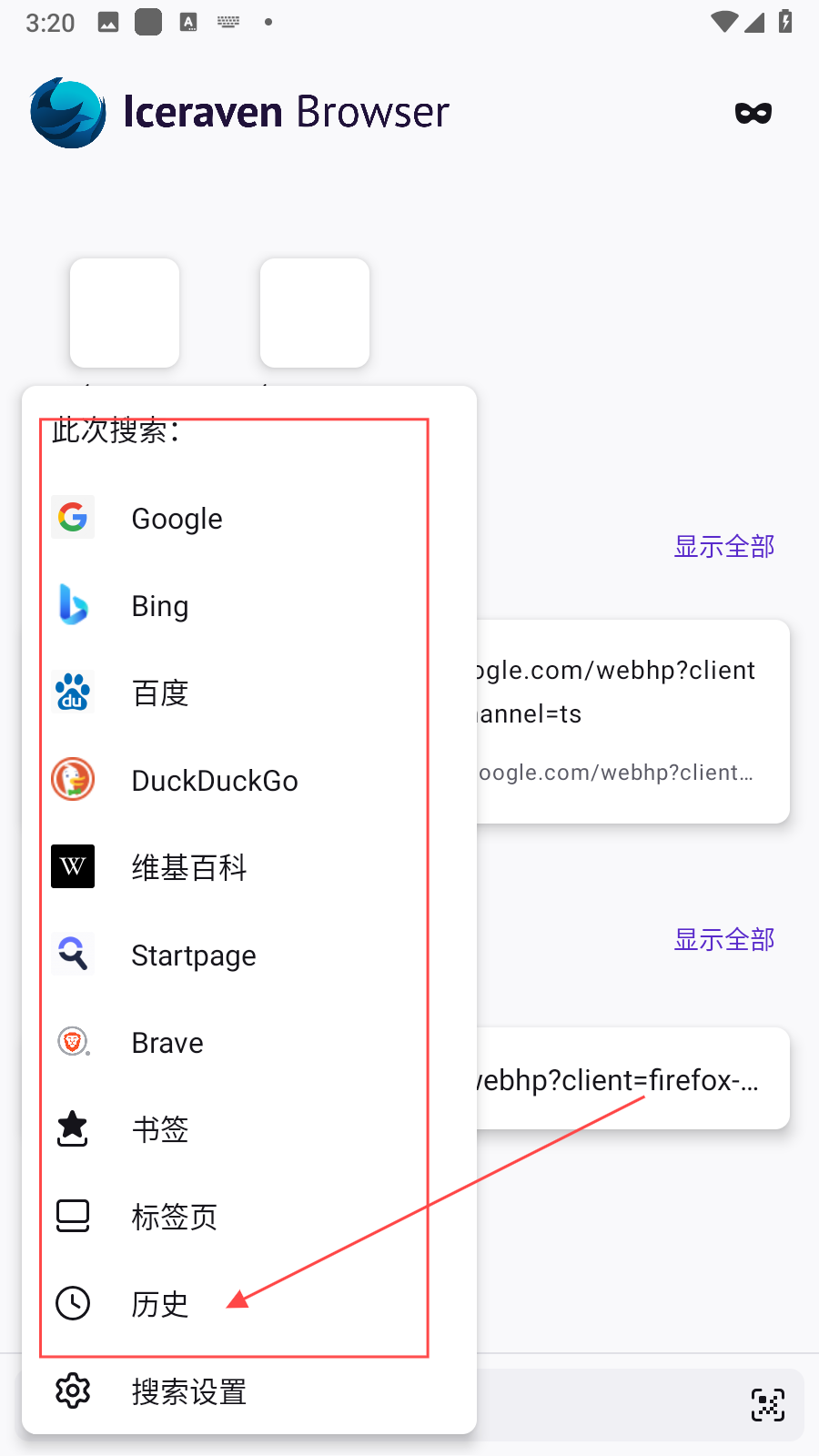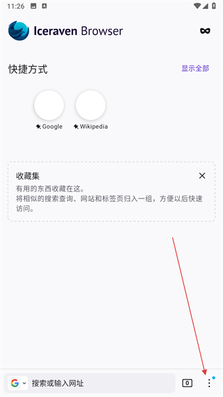 1、打開Iceraven Browser在主界面下方搜索欄,點擊后可輸入網(wǎng)址訪問網(wǎng)頁,也能輸入關(guān)鍵詞搜索內(nèi)容,點擊搜索欄左側(cè)圖標(biāo)還能選擇不同搜索引擎如Google、百度等。