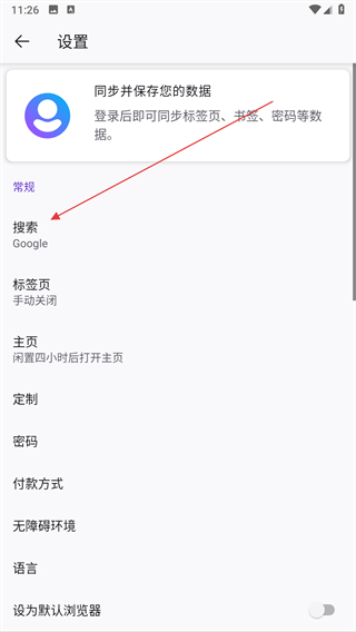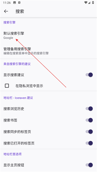 4、在搜索頁面,點擊默認(rèn)搜索引擎選項。