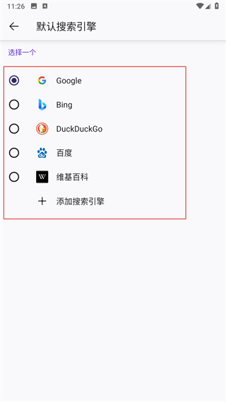 5、在默認(rèn)搜索引擎頁面,點擊想要的搜索引擎。