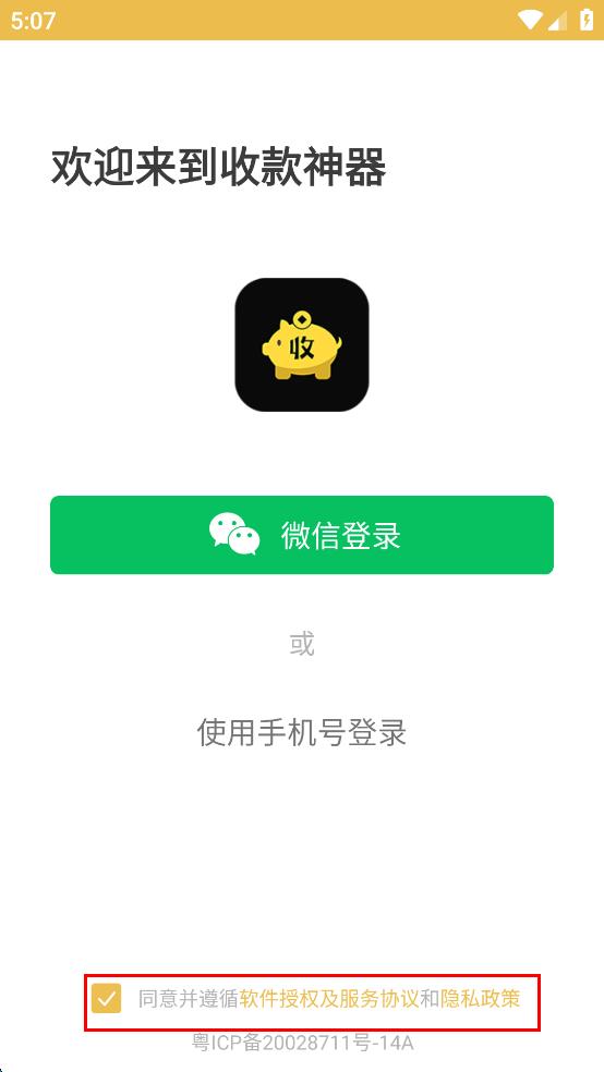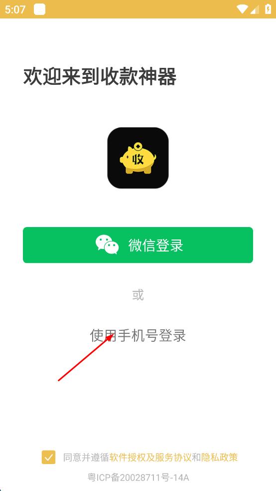 1、打開收款神器APP,勾選同意并遵循軟件授權及服務協(xié)議和隱私政策。