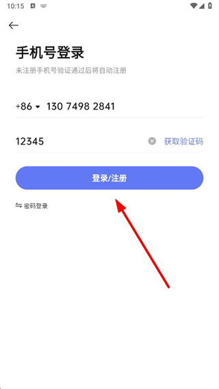 4、輸入收到的驗(yàn)證碼,點(diǎn)擊登錄注冊(cè)按鈕,未注冊(cè)的手機(jī)號(hào)將自動(dòng)完成注冊(cè)并登錄。