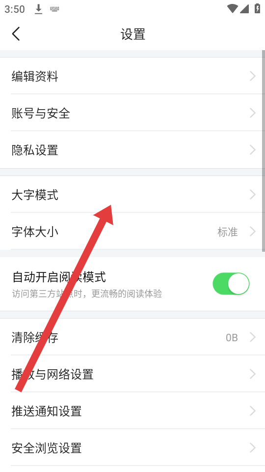 2、在個人主頁設(shè)置的界面中,需要找到并點(diǎn)擊大字模式的選項,跳轉(zhuǎn)至大字模式介紹頁面。