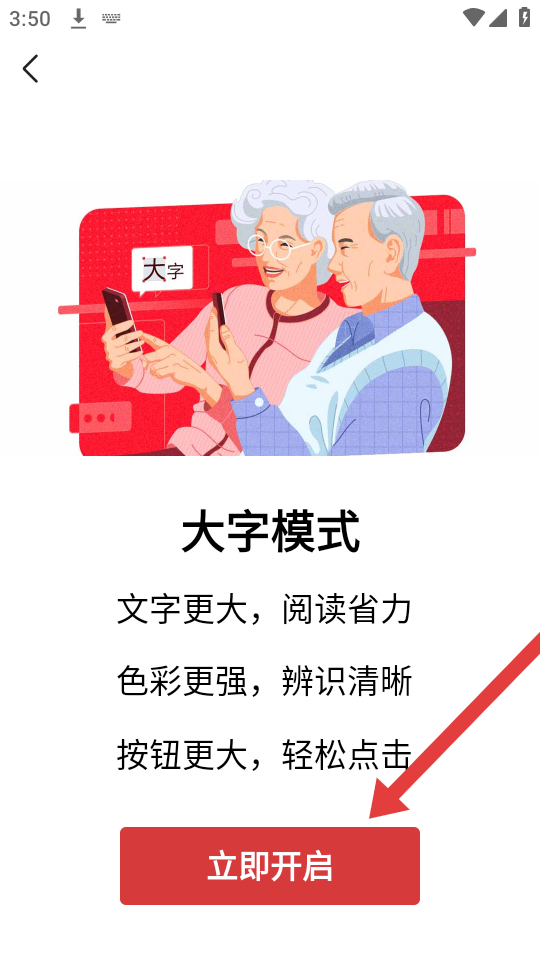 3、在大字模式介紹頁面,點(diǎn)擊紅色的立即開啟按鈕,即可開啟大字模式,獲得更清晰的閱讀體驗。