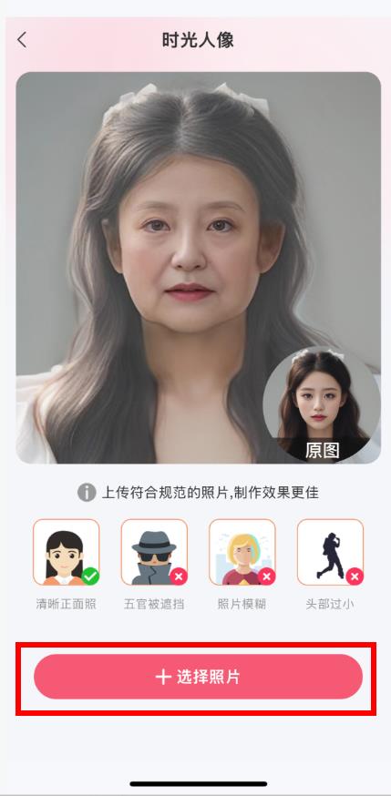 2、進入時光人像界面后,點擊下方紅色的+選擇照片按鈕。