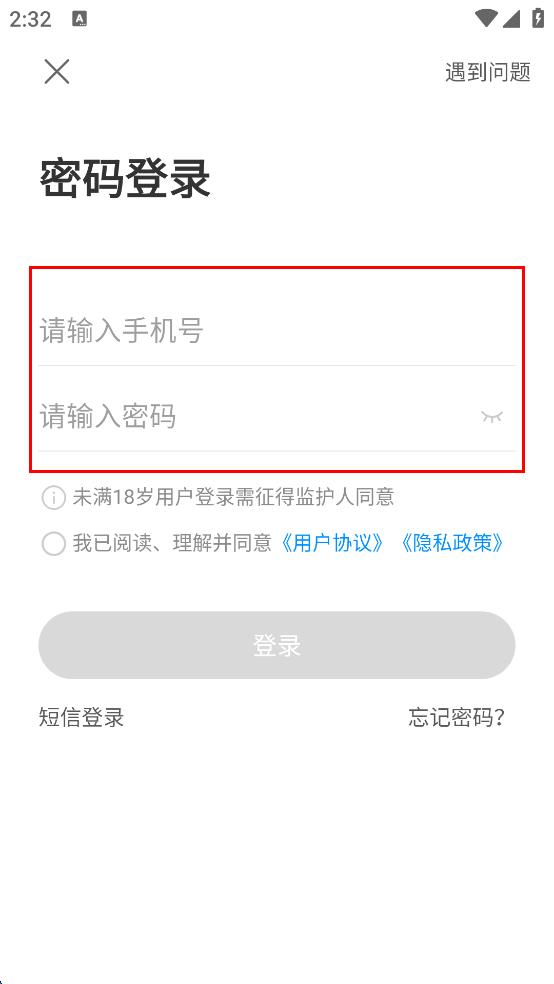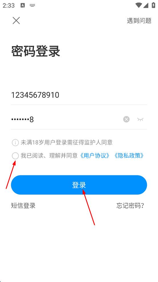 3、在密碼登錄頁面,先輸入手機(jī)號,接著輸入密碼,然后勾選“我已閱讀、理解并同意用戶協(xié)議,隱私政策。