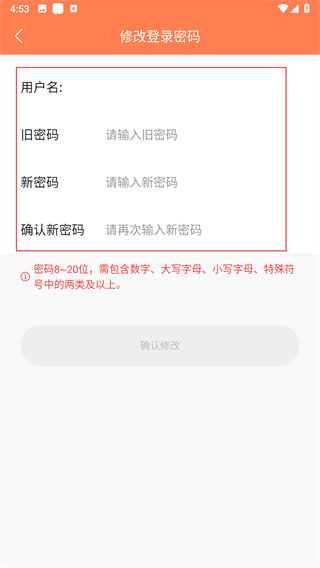 4、在修改登錄密碼頁(yè)面,依次輸入信息,輸入完成后點(diǎn)擊確認(rèn)修改即可。