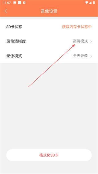 4、在錄像設(shè)置頁(yè)面,點(diǎn)擊錄像清晰度選項(xiàng)。