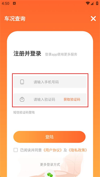 2、進(jìn)入注冊(cè)并登錄界面,輸入手機(jī)號(hào)碼和驗(yàn)證碼。
