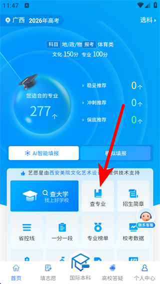 1、打開APP進(jìn)入首頁,點(diǎn)擊查專業(yè)按鈕,快速進(jìn)入專業(yè)查詢核心界面。