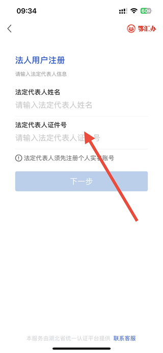 4、在法人用戶注冊(cè)頁面輸入法定代表人姓名、證件號(hào)等信息,按照提示完成后續(xù)操作即可完成法人身份注冊(cè)。