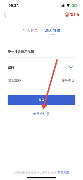 3、在法人登錄頁面點(diǎn)擊新用戶注冊(cè)選項(xiàng),進(jìn)入法人用戶注冊(cè)頁面。