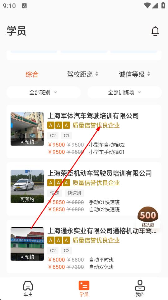 2、進(jìn)入APP主界面,點(diǎn)擊底部導(dǎo)航欄中的學(xué)員,瀏覽駕校列表,選擇想要預(yù)約的駕校。