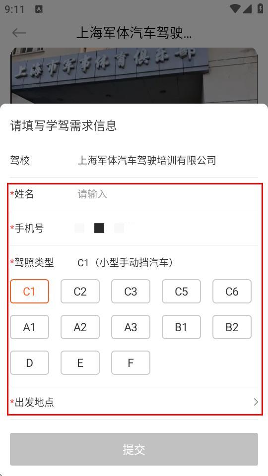 4、在彈出的請(qǐng)?zhí)顚憣W(xué)駕需求信息頁(yè)面,填寫信息,點(diǎn)擊提交,即可完成預(yù)約。