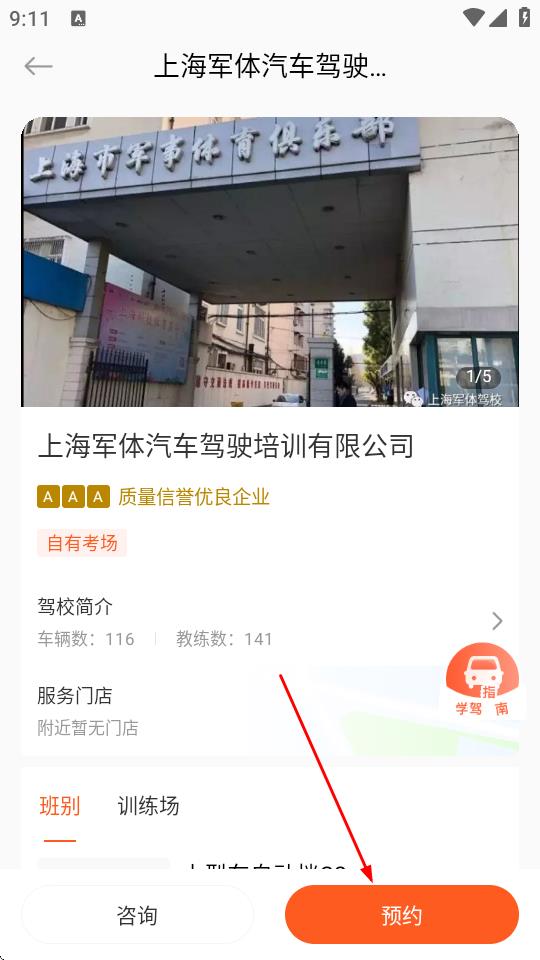 3、在駕校詳情頁(yè)面,點(diǎn)擊右下方的預(yù)約按鈕。